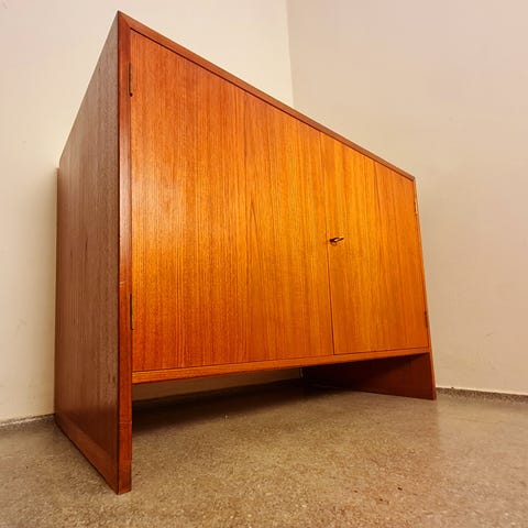 Skænk / skab tegnet af Hans J Wegner, produceret hos Ry Møbelfabrik. Udført i teak og base med massivt eg, hylder i lys bøg. Fremstår i let renoveret stand, dog med alm brugsspor, primært på toppen.