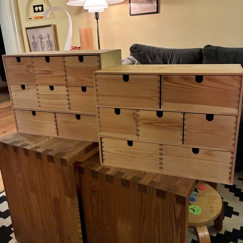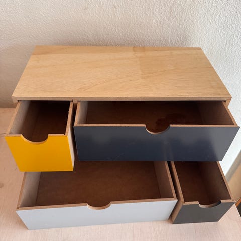 IKEA moppe skuffereol i lyse grå og blå farve. 16 små skuffer