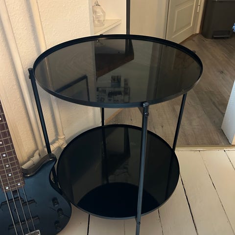 Lækkert barbord/sidebord med mørkt glas og “messing”-stel.