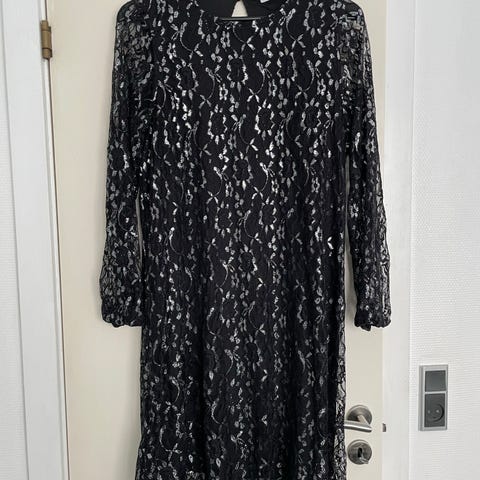 Fin blondekjole i marineblå blonde ovenpå sort foer. Sidder til på overkrop, løs i skørt. Ærmer uden foer.