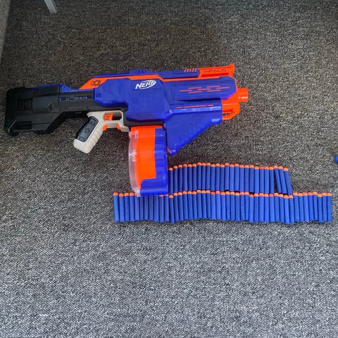 Nerf gun som virker og er testet, man skyder ved at trække den bagud. Man kan rulle den ud for at sætte flere skud i.