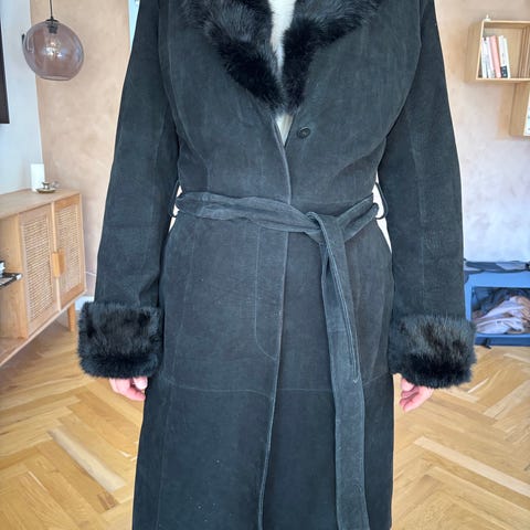 Super flot og lækker tynd frakke i ægte ruskind. Kan bruges indendørs og udendørs. Aldrig brugt - købt for 4000 kr.
