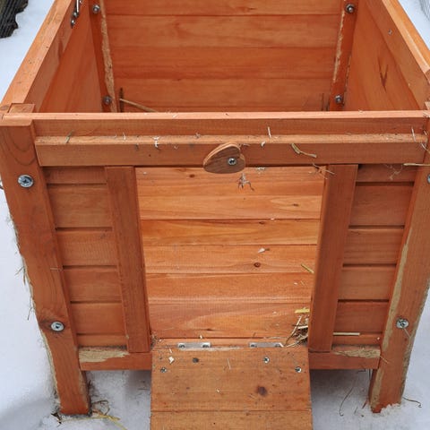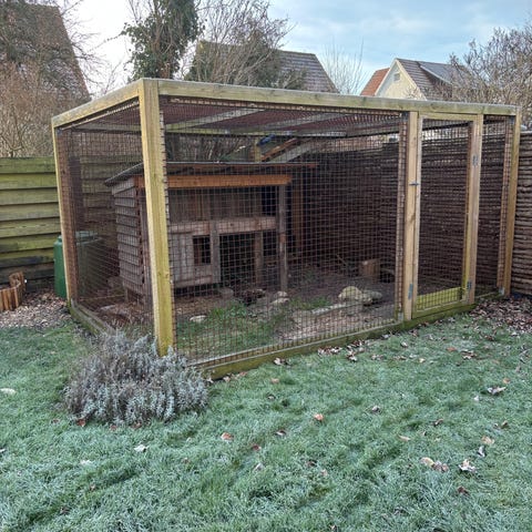 Fint bur/hus til fx høns eller kaniner. Der er brugsspor, men det fungerer som det skal. Pt er der sat presenning under husdelen, for at skærme for vind, men det kan bare tages af, der er nethegn bagved. Det er ret tungt. Huset er ca 85x220cm