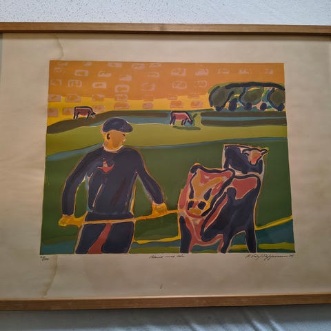 Litografi, Hans Voigt Steffensen, motiv: Ungarsk kærestepar , b: 56 h: 67, Signeret litografi nr 25 ud af 100 tryk i farver dateret 1983 “ungarsk kærestepar” indrammet i gylden træramme med glas. Lidt brugsspor på ramme se foto.