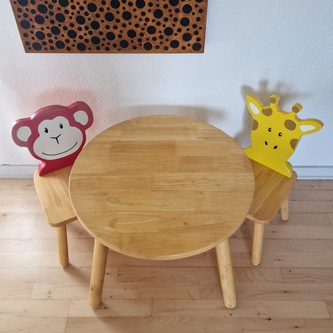 Børnemøbelsæt bestående af et bord og to stole i hvidt træ. Sættet er designet til børn og egnet til brug i hjemmet til aktiviteter som leg, tegning og spisning. Bordet og stolene har en enkel og funktionel konstruktion.