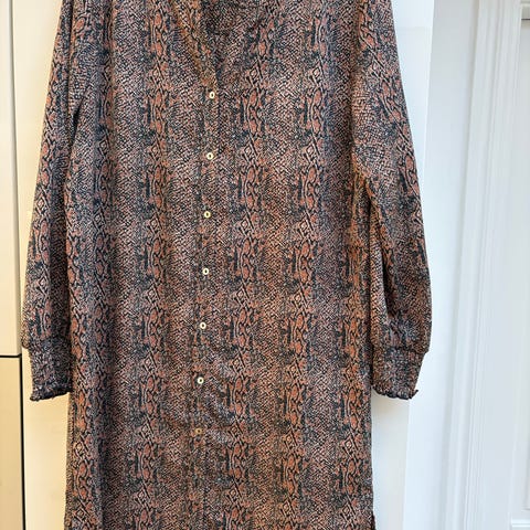 Let og behagelig i 100% viskose, med knapper foran, smock ved ærmerne og bindebånd i taljen, så den kan justeres i faconen.