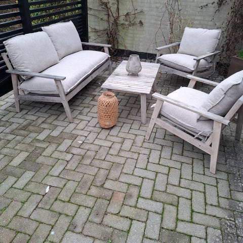Købt i sommers, brugt få gange ellers har den bar stået ude i haven. Hele sættet kan afhentes med det samme samt puderne til sættet