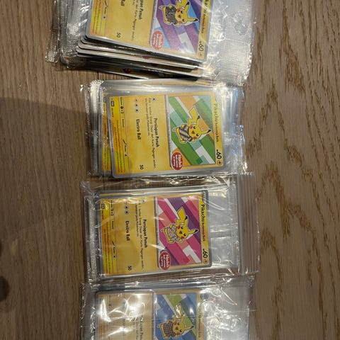 Samling fra Detective Pikachu inklusiv promo-kortet med Pikachu.