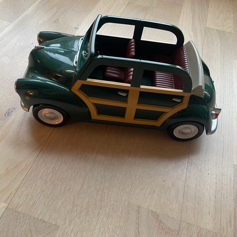 Sylvanian Families legetøjsbil i pink med beige detaljer. Bilen inkluderer aftagelige sæder og tilbehør som mad og små figurer. Fremstillet i plastik, designet til børn som en del af Sylvanian Families legetøjssæt.