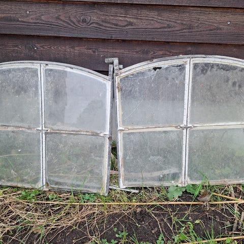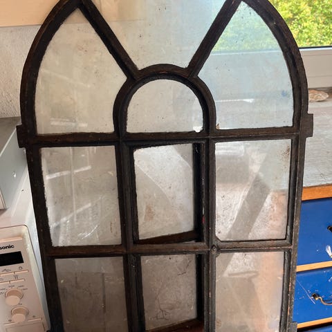Staldvindue i smedejern. 6 intakte glasfelter. H77, b51.
