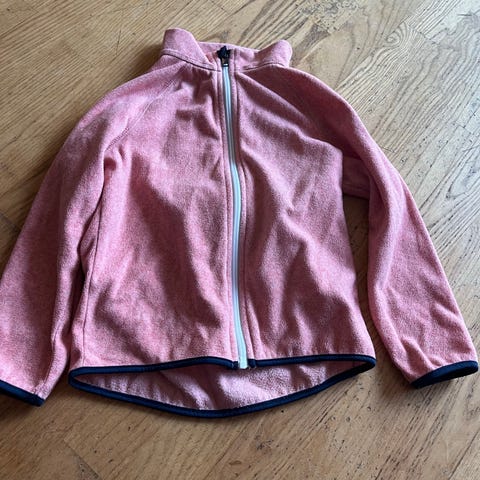 H&M børnejakke i lyserød farve, størrelse 98, designet til piger. Jakken har hætte med pelskant og er egnet til køligere vejr.