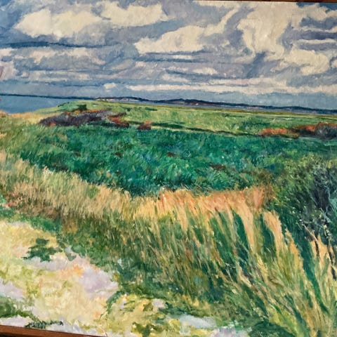Landskabsmalerier udført i olie på lærred med forskellige motiver som kystlandskab, marker og skov. Farvetonerne spænder over grønne, blå og jordfarver. Malerierne er uden ramme og kan anvendes til indretning af hjem eller kontor.