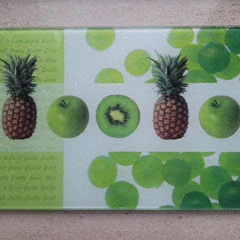 Multifunktionelle glasskærebræt, coaster, varmebrik med frugtmotiv i praktiske størrelser. Let ruflet overflade og praktiske skridsikre gummidutter i bund multifunktionelle frugtskærebræt. Står 100% godt fast på de 4 gummidutter. Stærke kønne farver, - lyser op i køkkenet.