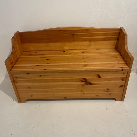 Smuk og solid antik fyrretræs slagbænk med opbevaringsrum under sædet.