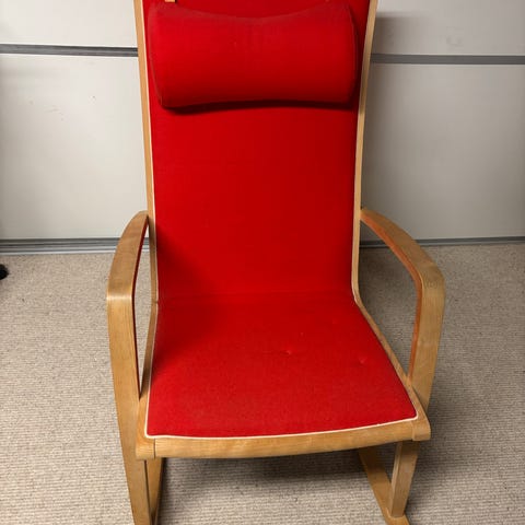 Rød gyngestol med fodskammel i træ og stof