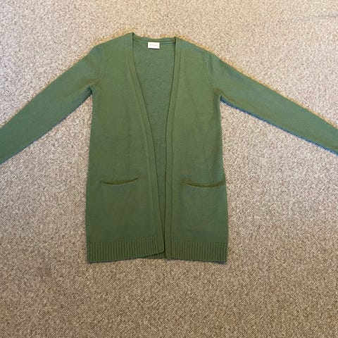 Halvlang cardigan med lommer i brun. Stoffet bærer lidt præg af vask.