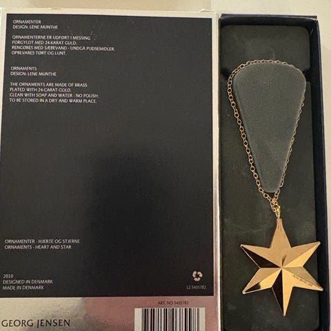 Forgyldt Topstjerne fra Johanne by Georg Jensen med rødt langt silkebånd, så den kan hænge hele december, hvorefter den juleaften kan sættes på juletræet med den medfølgende spiral.
