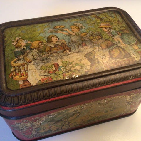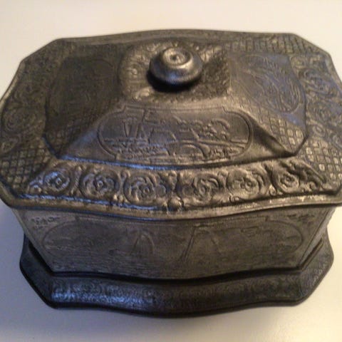 Antik blikdåse som har set bedre dage , er godt slidt, men det er en dåse men et KONGEPAR , FREDERIK VIII og DRONNING LOUISE, så kan være sjov at have i samlingen, mål 21 x 11 x 4,5 cm, Søgeord ! Samler, samleobjekt, dåse, dåser .SENDER KUN MED DAO ELLER AFHENTNING.