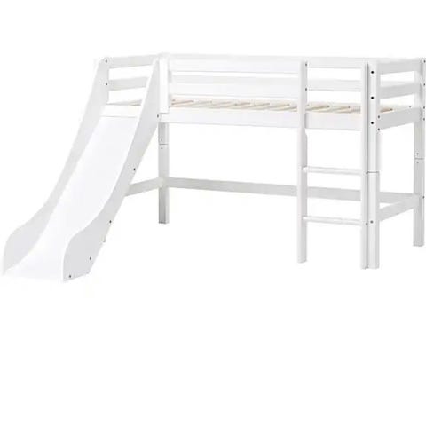 Super fin halvhøj ridderseng. Sengen har udvendige mål: L: 168 x H: 105 x D: 81 cm. Der kan eventuelt medfølge en madras. Pladsen under sengen kan eksempelvis bruges til reoler, hyggerum, hule eller legebord.