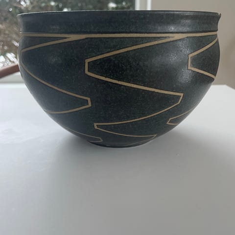Keramik dekorationsskål med brun yderside og grå spiralformet mønster i midten.