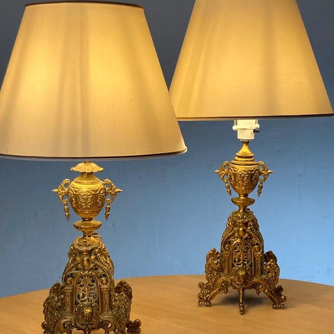 2 Store og smukke bordlamper i porcelæn / fajance med forgydninger. Krakéleret look. Absolut smuk stand med meget begrænset patina. Højde inklusive lampeskærme: 70 cm. Diameter lampeskærm: 50 cm. Beige / sandfarvet porcelæn og lampeskærme. Disse 2 bordlamper sendes ikke. Prisen er samlet pris for 2 bordlamper.