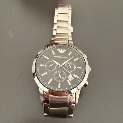 Armani mandeur med stållænke og sort urskive. Uret er fremstillet i stål og andet materiale, designet til mænd. Funktioner inkluderer kronograf og datoindikator. Uret har en klassisk og tidløs stil med en robust og holdbar konstruktion.
