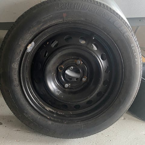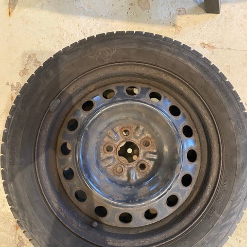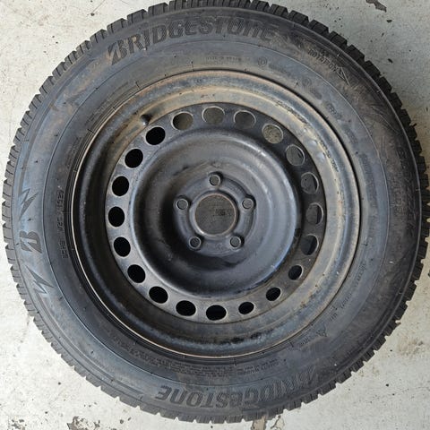 Stålfælge med vinterdæk 4-5mm men bør skiftes, rustne i overfladen men uden skader.