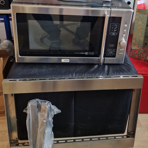 Mikrobølgeovn med ydre i stål. Udstyret med betjeningsknapper og drejeknap til indstilling af tid og effekt. Passer til opvarmning og tilberedning af mad.