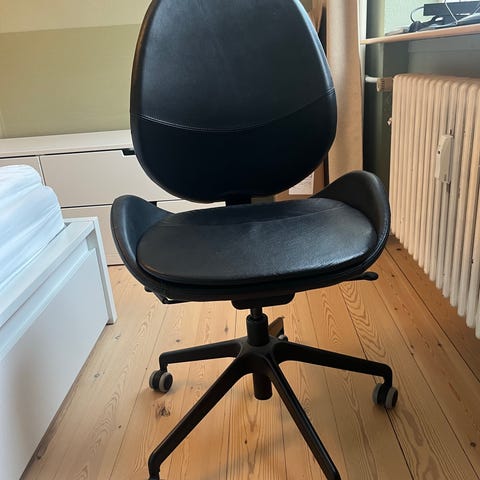Kontorstol med håndtag til højdejustering. Har god vippefunktion i ryglænet.
