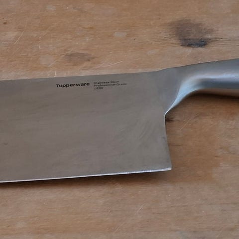 Raadvad køkkenkniv med bredt blad og træhåndtag med tre nitter. Kniven er designet til alsidig brug i køkkenet, egnet til hakning og skæring af forskellige fødevarer. Bladet er lavet af rustfrit stål, og håndtaget sikrer et fast greb under brug.
