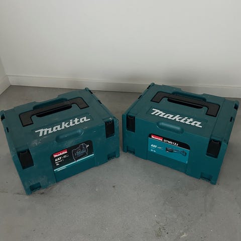 Makita DDF483RFJ boremaskine sæt i blå farve. Indeholder opbevaringskasser designet til at beskytte og organisere værktøj. Materiale og specifikke dimensioner fremgår ikke, men sættet er velegnet til opbevaring og transport af boremaskiner og tilbehør. Og DET ER KÅN KASSERNE og send ikke skal komme og hentes
