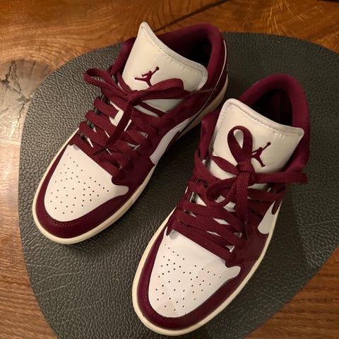 Nike Air Jordan 1 Mid sneakers i sort og rød farve. Skoene er størrelse 45, 5.Materialet består af klassisk læder og tekstil. Skoene har en mid-top pasform med snørebånd og Air Jordan-logo på hælen.
