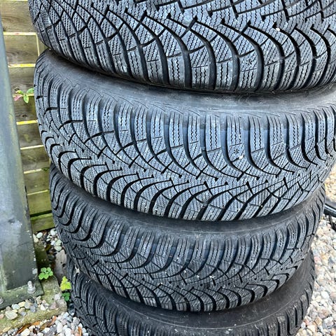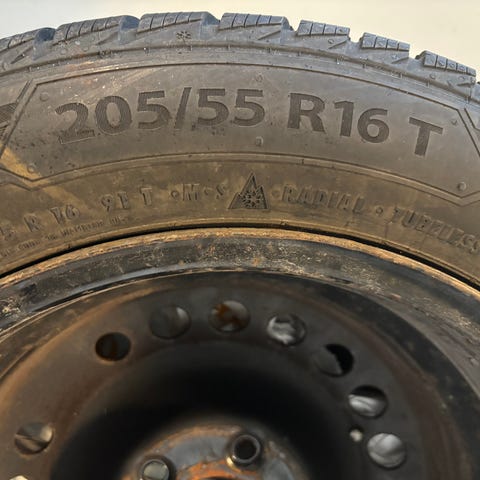Vinterdæk på stålfælge, brugt en sæson (2024-2025) - Jeg kender ikke boltmønster eller centerhul diameter, men der står en masse tal som jeg har taget billeder af. De har siddet på en KIA Ceed stationcar og fremstår som nye...