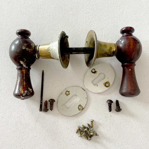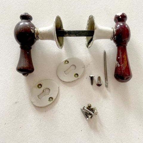 Leveres komplet med alle endeskruer, splitter, messingbøsninger og ligekærv stålskruer til direkte montering på ældre dørtype.