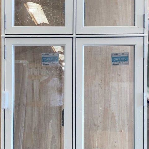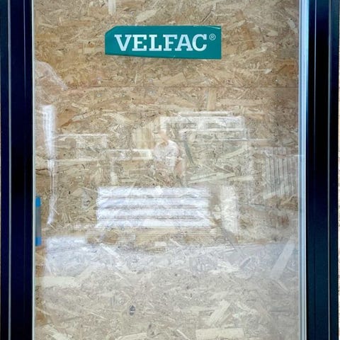 Velfac træ/alu sidehængt vindue med matteret energiglas - der er blindstykke i øverste venstre vindue.