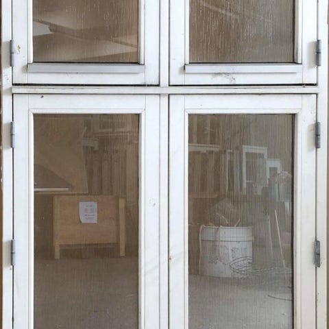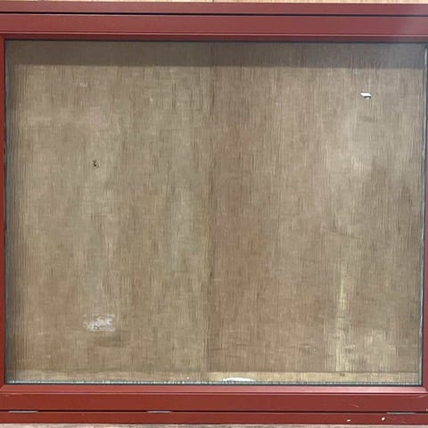 Sidehængt bondehus vindue i træ med matteret glas.