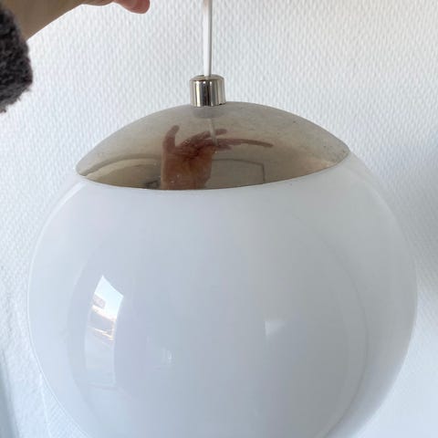 Loftlampe med rund form, hvid glasplade og sort kant. Diameter ca. 30 cm. Passer til montering i loftet som generel belysning.