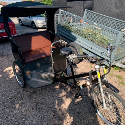 Cykeltaxa i unikt special design fra 'sorte hest', har kørt som taxa i Skagen, fin til transport af 2 personer + grej. Let kørt, 2 bremser, 3 gear, Alu 'sofa gør den let