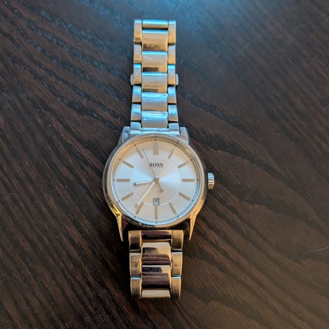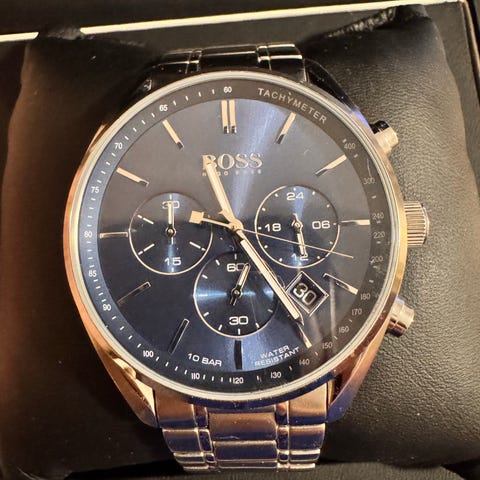 Hugo Boss herre chronograph ur med rustfrit stål rem og blå urskive. Uret har flere funktioner inklusive stopur og datovisning. Designet til mænd med en robust og stilfuld fremtoning.
