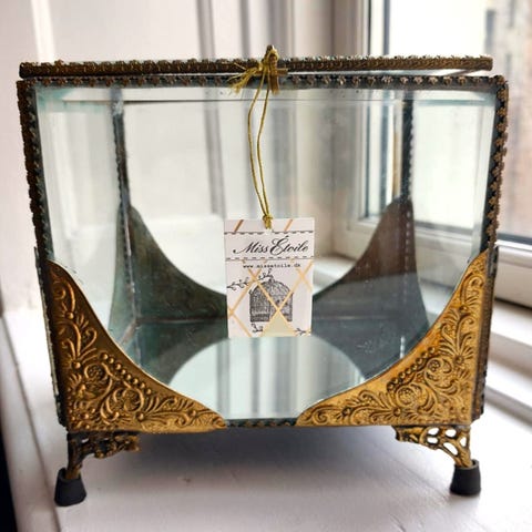 Gammelt skrin med løvefødder af metal og tykt glas.