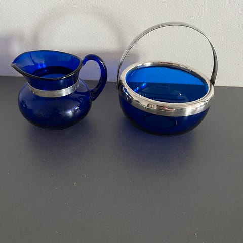 Gammel Holmegaard marmelade krukke. Er slebet med striber, har tin låg fra Just Andersen, højde 12.5 cm. Sender ikke skal afhentes.