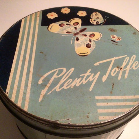 En stor gammel blikdåse, fyldt med billeder af hvor man kan købe the i hele verden, mål 27 x 22 x 16 cm , Søgeord! Samler, samleobjekt , dåser , dåse .SENDER KUN MED DAO ELLER AFHENTNING.