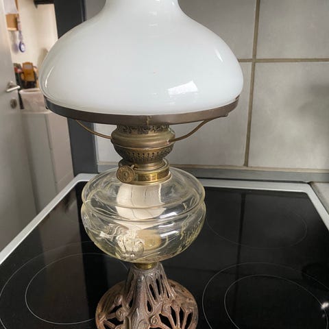 Denne lampe er lavet af grønt glas med metal komponenter. Den har en rund base og en glas skorsten til at beskytte flammen. Lampen anvendes til olie som brændstof og har en justerbar væge mekanisme. Den kan bruges som en dekorativ lyskilde i hjemmet. Dog virker dreje mekanismen ikke - skal repareres. Sælges for 100kr i Helsinge