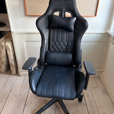 Den er super behagelig, kan køre op og ned, og ryglænet kan også justeres, ift om stolen skal ligge ned eller sidde ret op. Nakkepude haves også, udover den ting der gør den sidder helt fast.