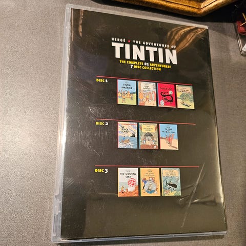 Komplet samling af alle Tintin eventyr. 21 eventyr på 7 dvd skiver. Alle skiver er flotte og uden ridser, i metal boks.
