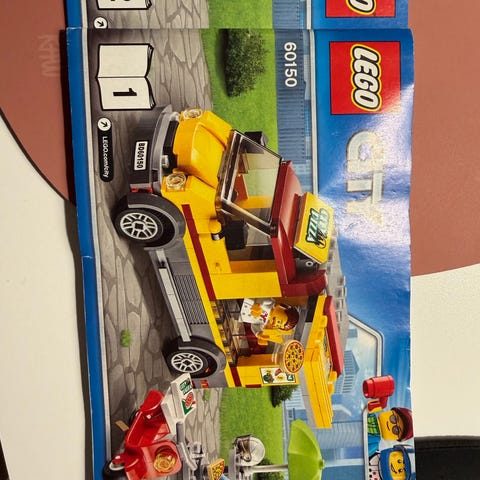 Lego City, 60150, Pizzavogn. Komplet med alle brikker, minifigurer og instruktion. Der mangler dog et enkelt klistermærke - nummerpladen foran på vognen. En enklet brik har været lidt bøjet, men den sidder i bunden af bilen, så det ses ikke, når sættet er bygget.