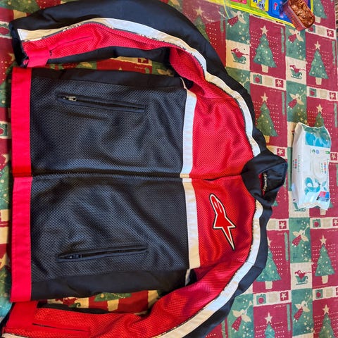 Alpinestars læder motorcykeljakke i sort farve str M. Jakken har justerbare stropper i taljen og lynlåse ved ærmerne for tilpasning. Designet til at give beskyttelse og komfort under motorcykelkørsel.
