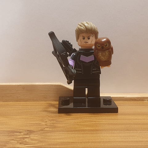 Lego Marvel sh0172 Hawkeye - Black and Dark Red Suit, Reddish Brown Spiked Hair, inklusiv bue.