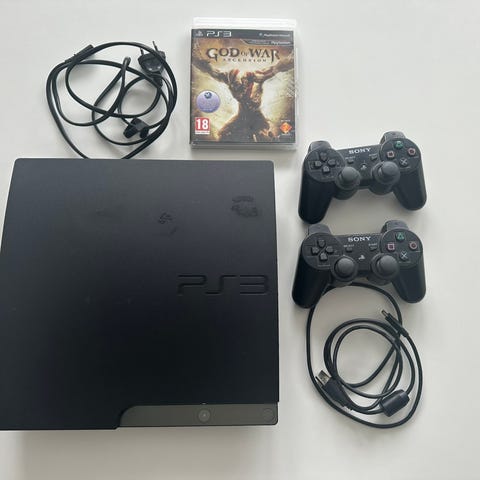 Sony Playstation 3 spilkonsol med to controllere og en samling af 12 spil. Spilkonsollen er sort og har et kompakt design. Spil inkluderer forskellige genrer som action, sport og eventyr, hvilket giver mulighed for varieret spiloplevelse.