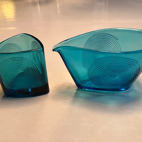 Fin ældre Skjold flødekande - i presset glas, oval og med hældetud. Designet af Per Lütken for Holmegaard i 1960'erne. Højde 6 cm, længde 11 cm. I fin stand. Kan sendes på købers regning.